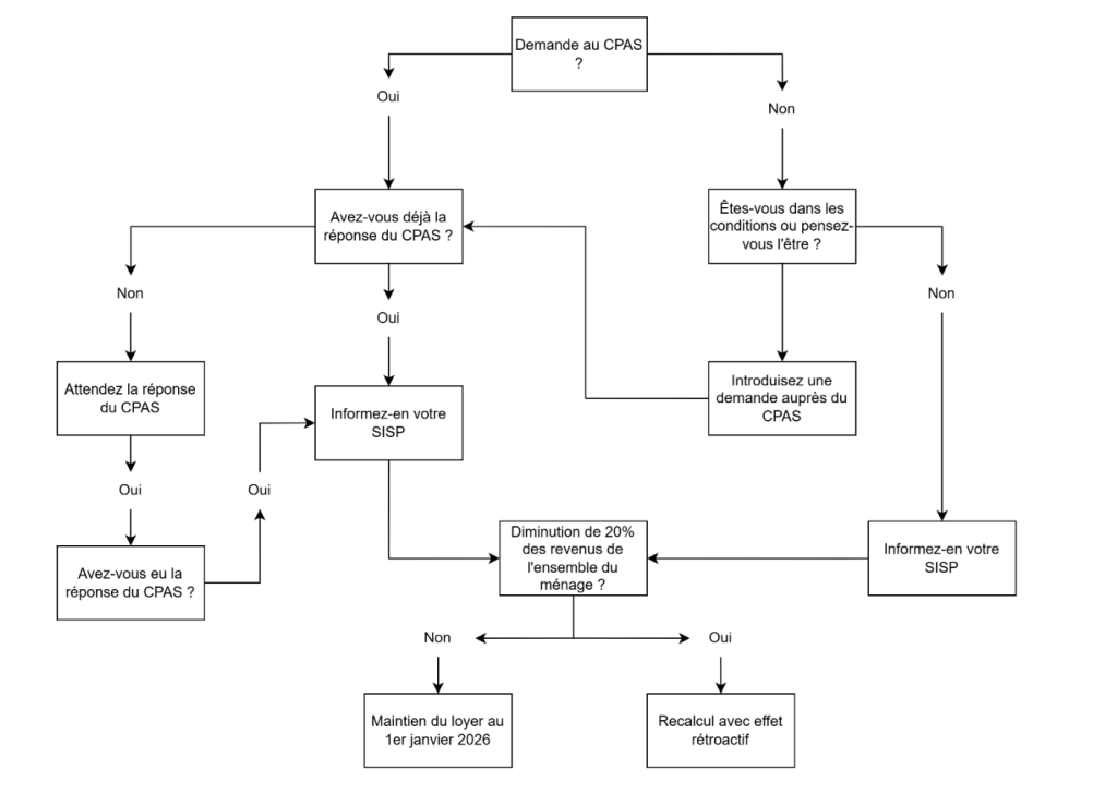 Si le Logement Bruxellois constate que vous n’avez pas droit à une aide du CPAS et que la perte de vos allocations de chômage a pour conséquence une baisse de 20 % des revenus de votre ménage par rapport à ceux pris en compte pour le calcul du loyer 2026, votre loyer sera recalculé avec effet